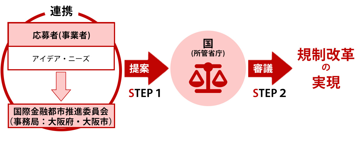 ※応募者等と大阪府市が協働で、国に対して規制改革の提案を行い、国において審議の上、規制改革等を実現